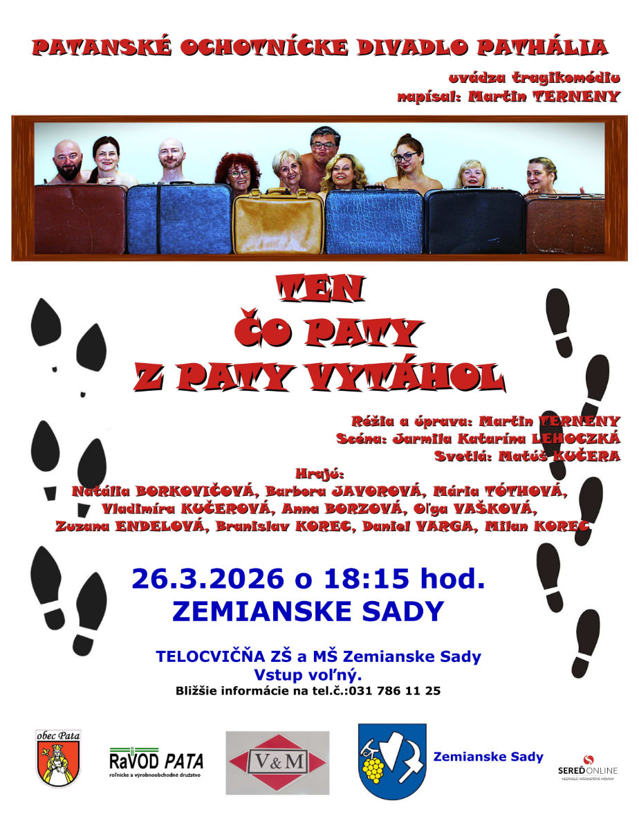 /v AktualityObec Zemianske Sady Vás srdečne pozýva na divadelné predstavenie „Ten čo paty z Paty vytáhol“, ktoré odohrá Patanské ochotnícke divadlo Pathália vo štvrtok 26. marca 2026 o 18:15 hod. v Telocvični Základnej školy s materskou školou Zemianske Sady. Vstup je voľný. Bližšie informácie na telefónnom čísle 031 786 11 25