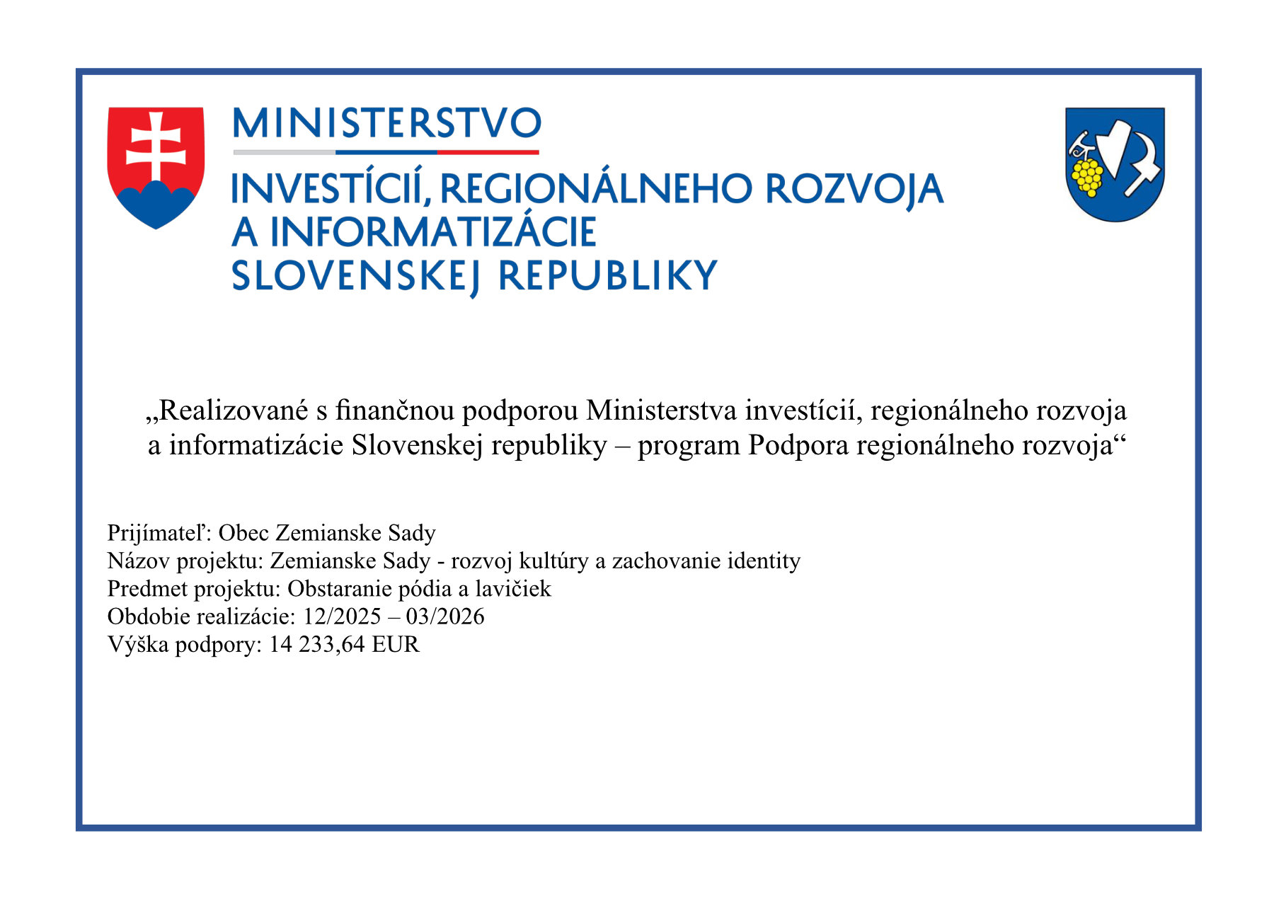Prijímateľ: Obec Zemianske Sady